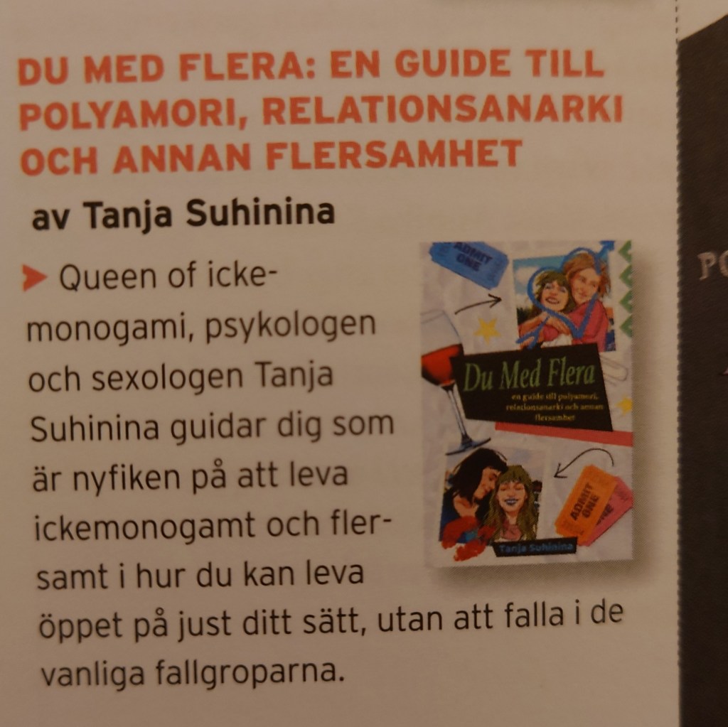 Jag heter Tanja Suhinina. Jag är psykolog och sexolog som själv levt flersamt i över två decennier. Idag jobbar jag på min mottagning Eros & Psyke där jag möter många flersamma, håller webbkurser och har skrivit den efterlängtade svenska boken om flersamhet Du med flera. Senast har jag fått bre ut mig i marsnumret av tidningen Ottar som hade tema flersamhet.