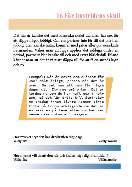 Varför har man sex är en arbetsbok där du får fokusera på drivkrafterna bakom din sexualitet. Boken består av tre avsnitt. Det första är en introduktion till hur man kan tänka kring motivation. I det andra möter du på över 40 drivkrafter som man kan styras i sin sexualitet (med exempel som visar hur det kan se ut i praktiken). I sista delen får du tillfälle att reflektera över vad som driver dig och om du vill förändra något.